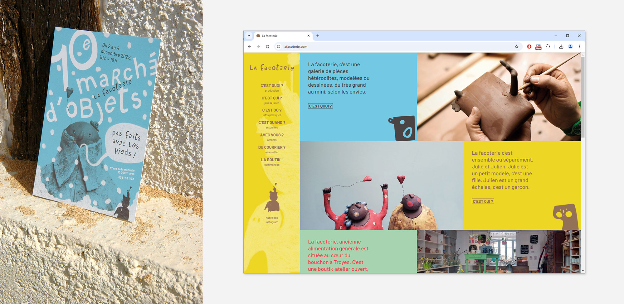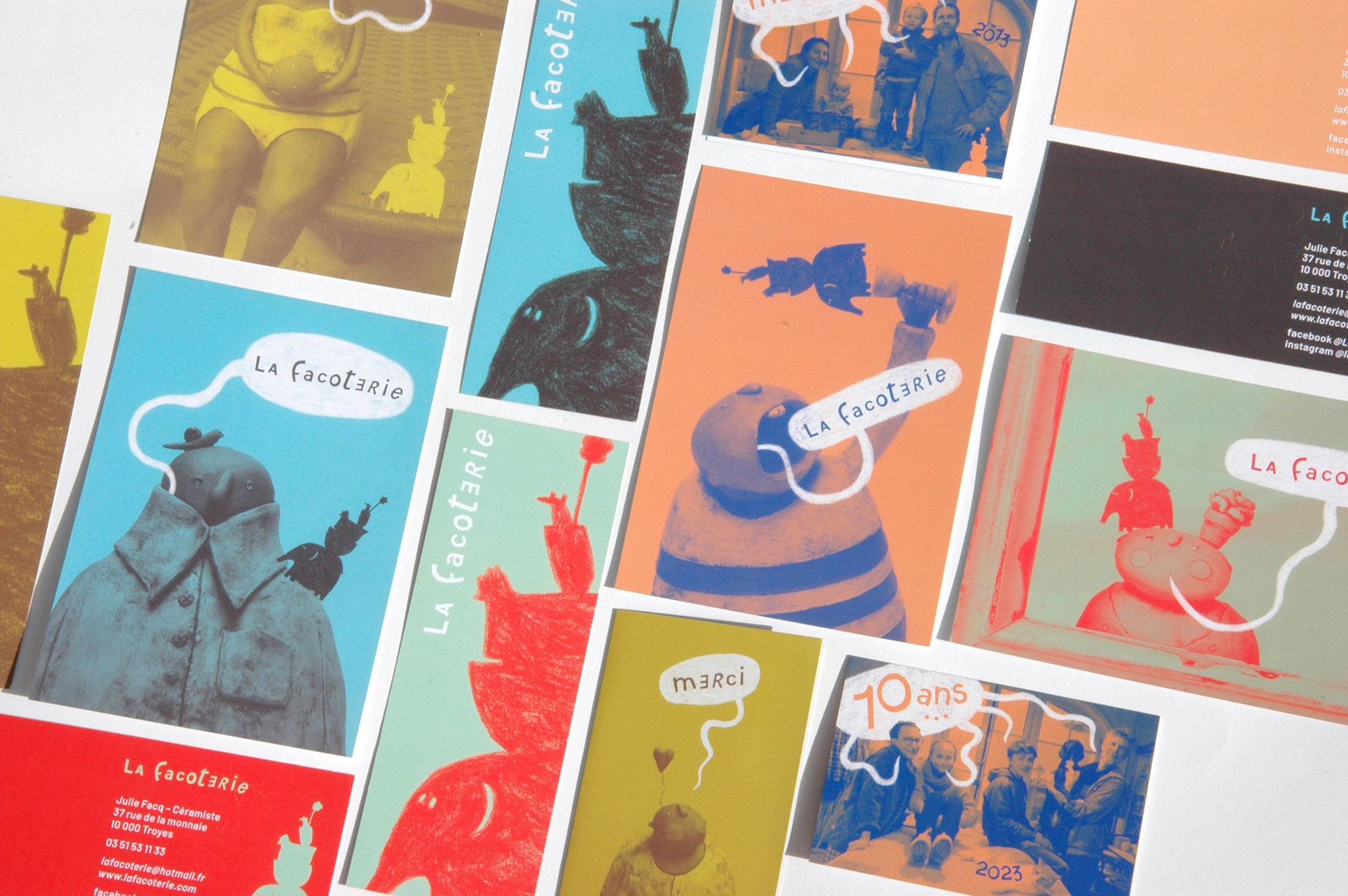 Refonte d’identité visuelle pour la céramiste Julie Facq (La Facoterie). Proposition d’un système graphique ludique et coloré, dont la palette est issue des créations de Julie. Quatre bichromies peuvent être utilisées pour décliner les supports imprimés et numériques, permettant ainsi différentes ambiances visuelles.