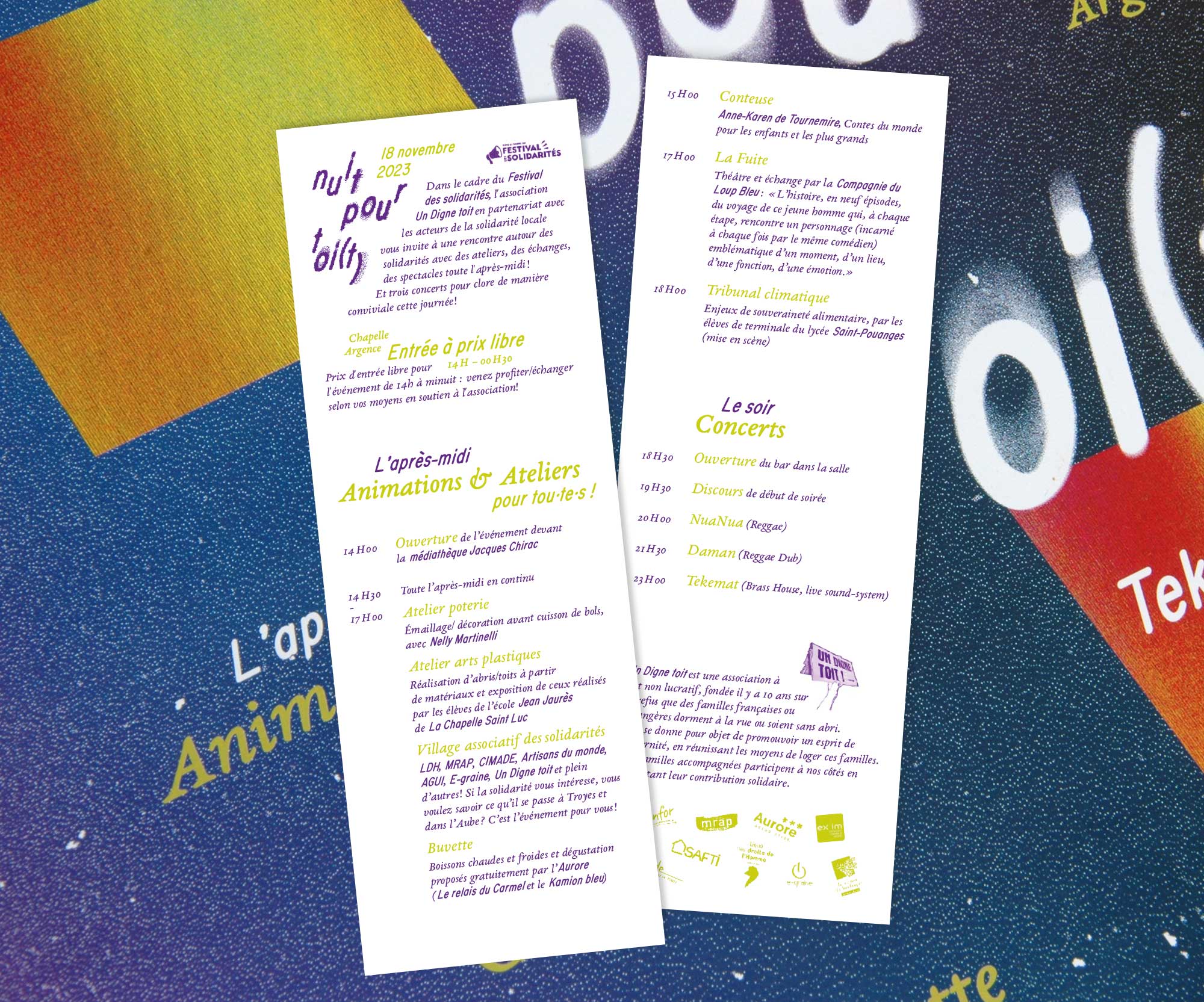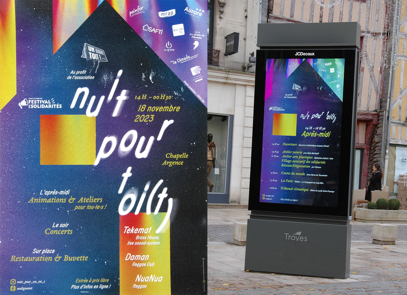 Journée organisée par et au profit de l’association « Un digne toit », fondée en 2013 sur le refus que des familles françaises ou étrangères dorment dans la rue. Création d’une identité où la nuit se fait foyer pour accueillir un évènement festif et familial, sous le feu des projecteurs.