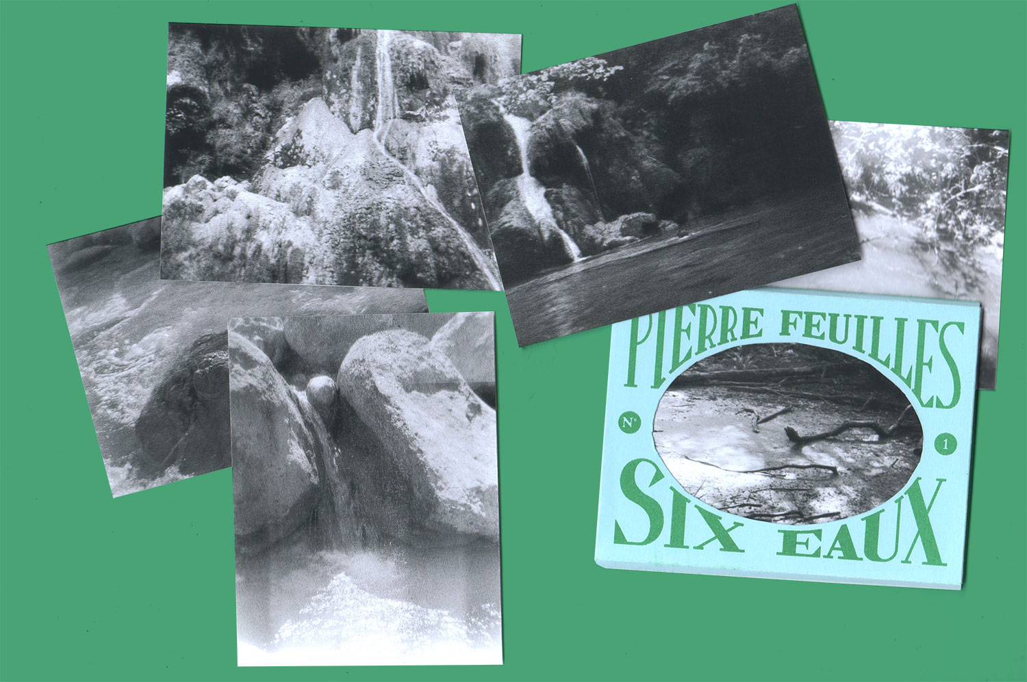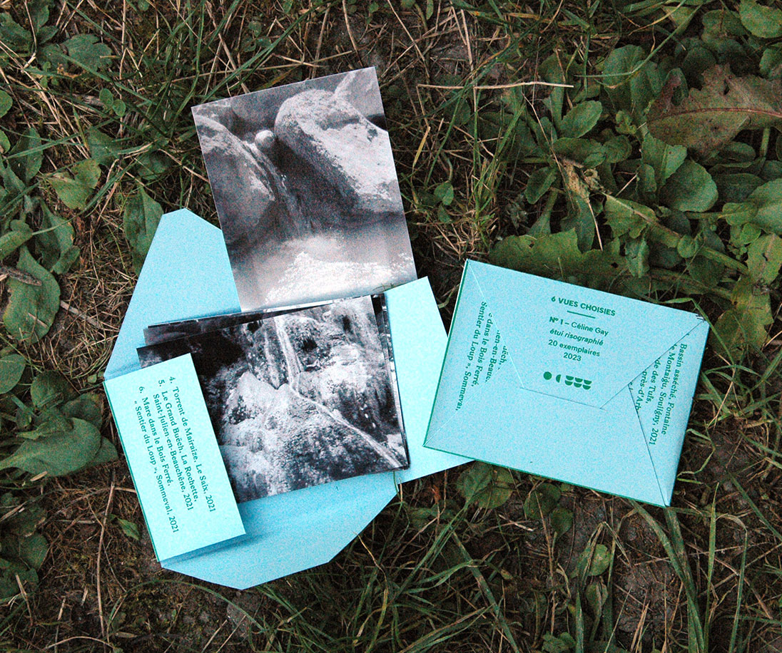 Pierre Feuilles Six Eaux revisite l’esthétique des anciennes pochettes photos éditées par La Cigogne, présentant des vues touristiques de villes et régions. Ici, chaque pochette dévoile 6 images qui propose un regard sur des paysages d’eaux.